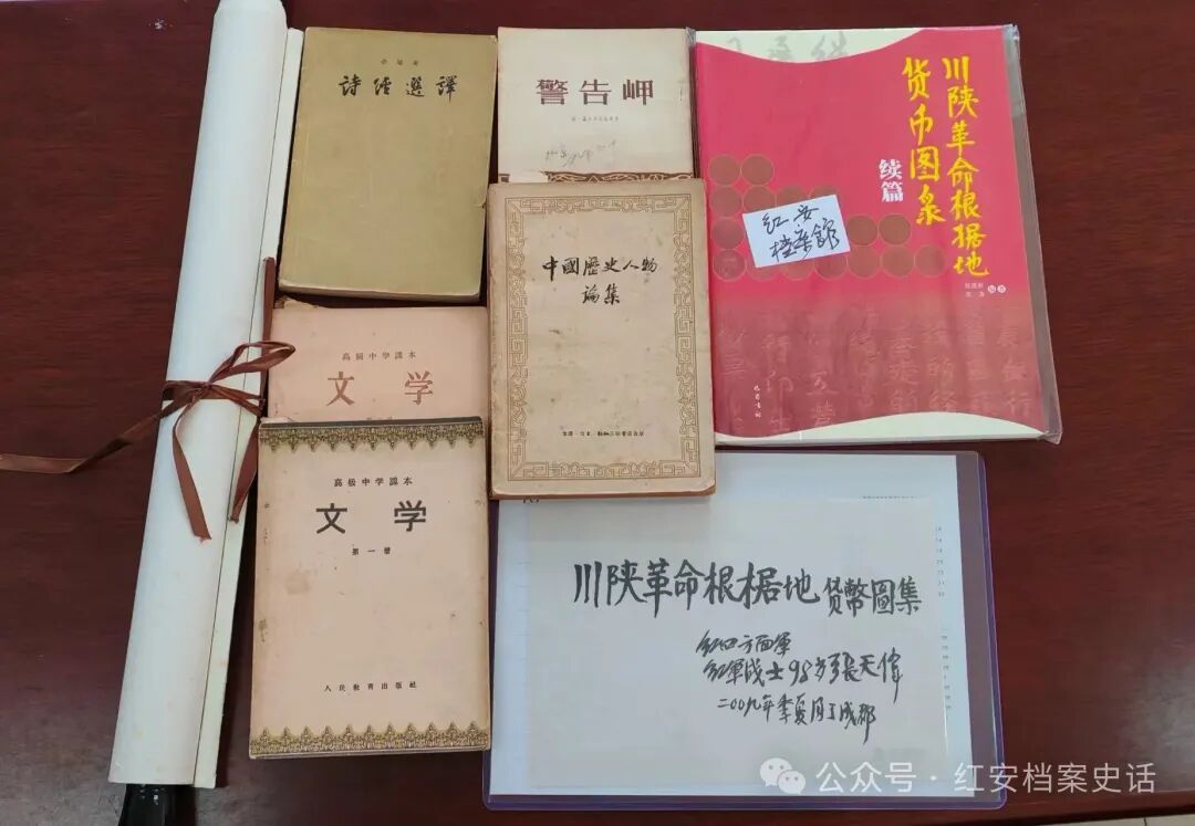 这批红色档案分别是:张天伟亲笔书写 “川陕革命根据地货币图集” 书法 1 幅、《川陕革命根据地货币图录﹡续篇》1 册、《中国历史人物论集》1 册、高级中学课本文学第一、二册各 1 册、《警告岬》1 册、《《诗经》选译》1 册,以及张天伟亲笔书写书法(已装裱)1 幅。