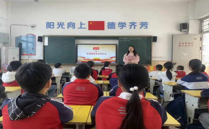 与此同时,各村分会场同步发力,村干部、网格员走村入户,针对老年人、留守儿童等群体开展一对一宣讲,利用村广播循环播放国家安全知识,确保宣传覆盖偏远村组,不留宣传死角。镇中心小学开展“国家安全进校园”主题课堂,通过安全知识讲解、观看教育短片、主题互动交流等形式,向学生普及国家安全、校园安全知识,从小培养孩子们的国家安全责任感,让国家安全意识根植童心。