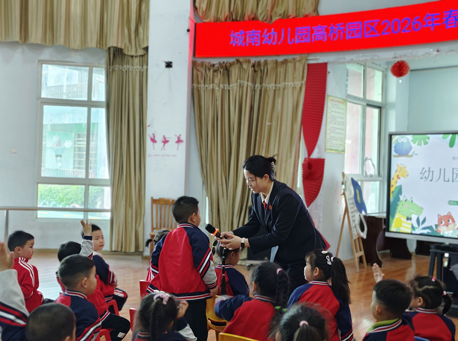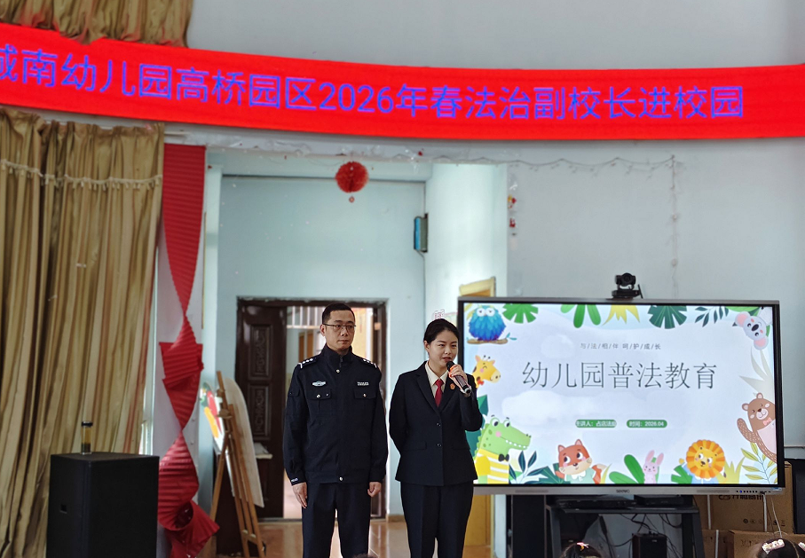红安网消息 4月24日上午,红安县城南幼儿园高桥园区开展“法治进校园”教育活动。法治副校长姚律师、陈警官入校开展法治安全教育主题活动,为孩子们送上一堂干货满满、趣味十足的法治安全启蒙课。