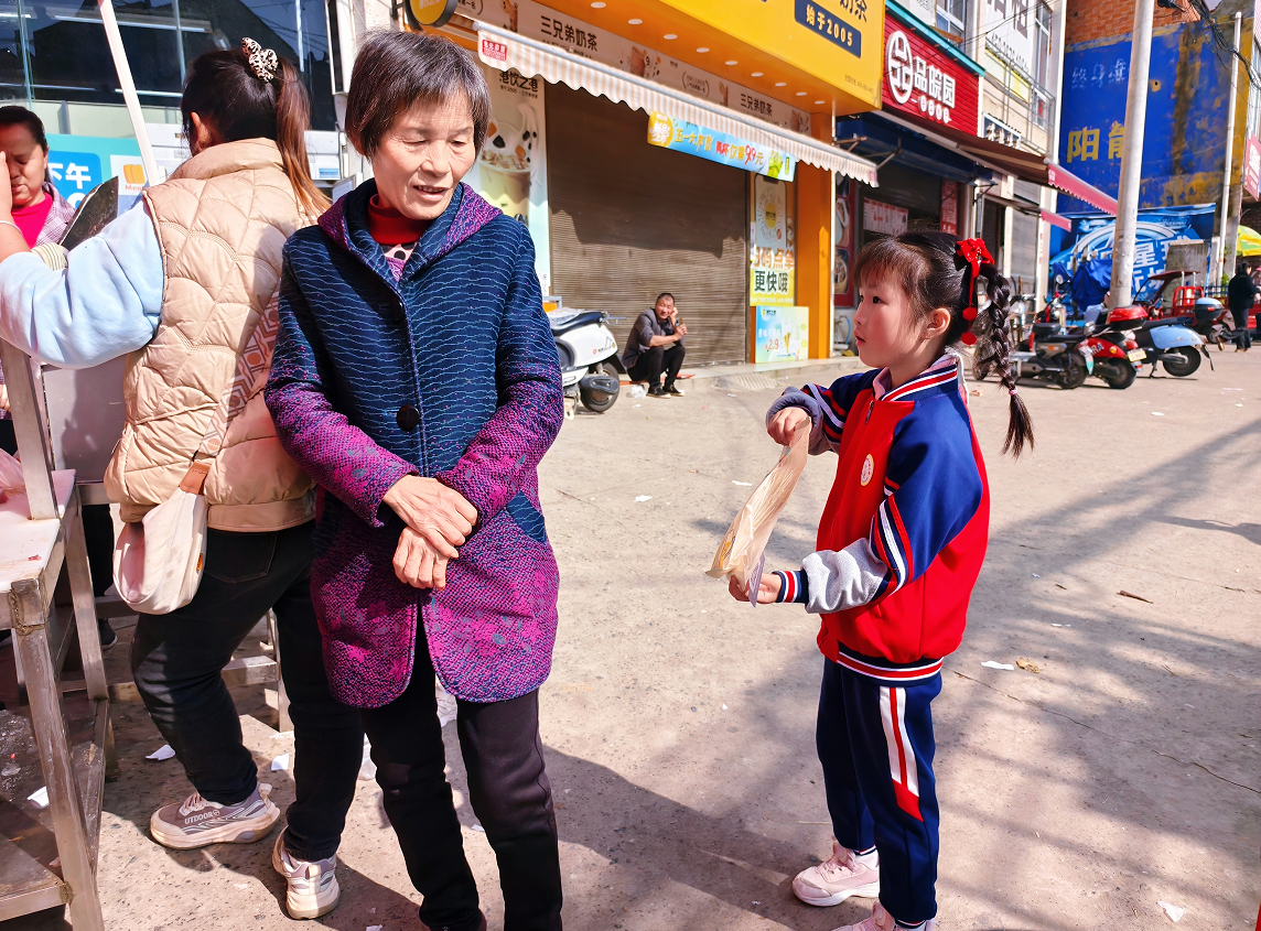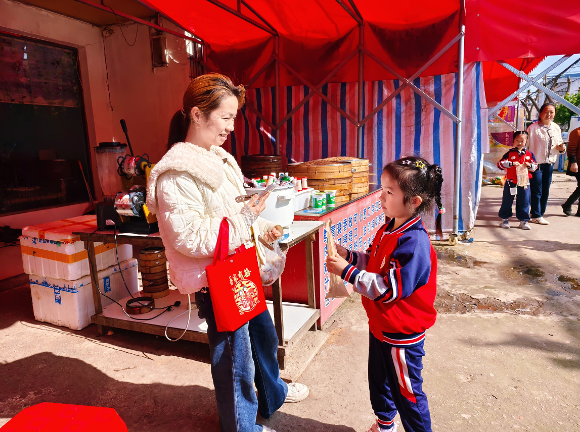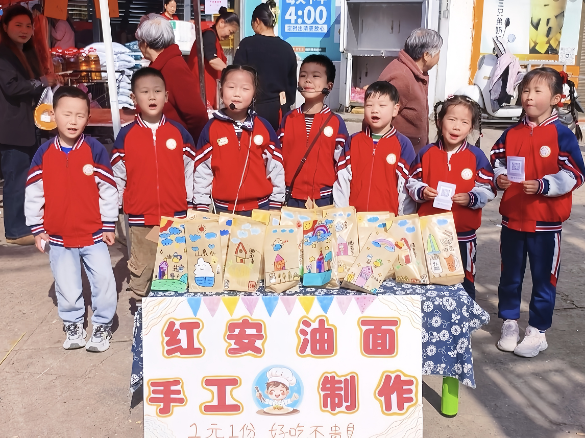 活动前期,教师带领幼儿系统了解红安油面的制作工艺与营养特点,并指导幼儿练习礼貌用语及基本推销话术。活动中,孩子们走进詹店社区文体广场,勇敢主动地向过往市民介绍家乡特产红安油面,大方展示、热情推荐。即使偶尔遭到拒绝,幼儿也能及时调整心态,互相鼓励、团结协作。